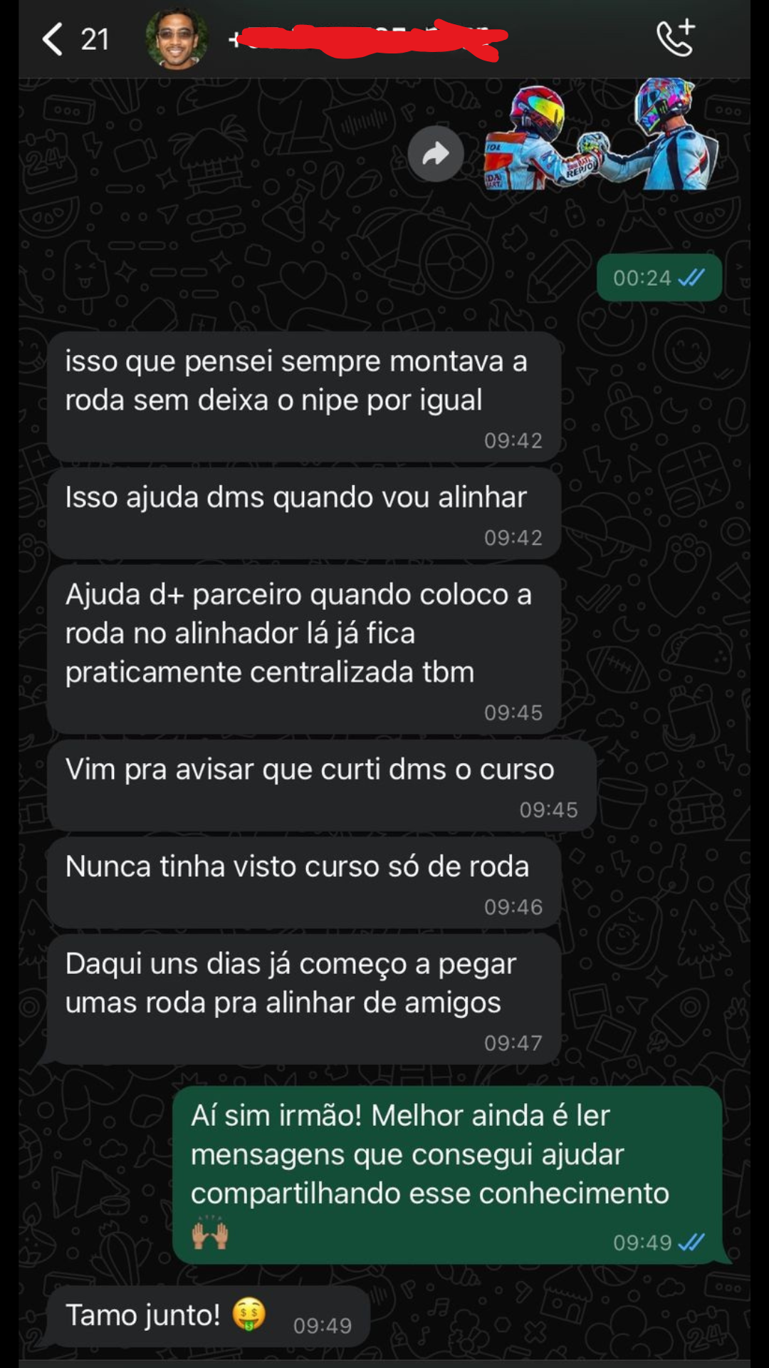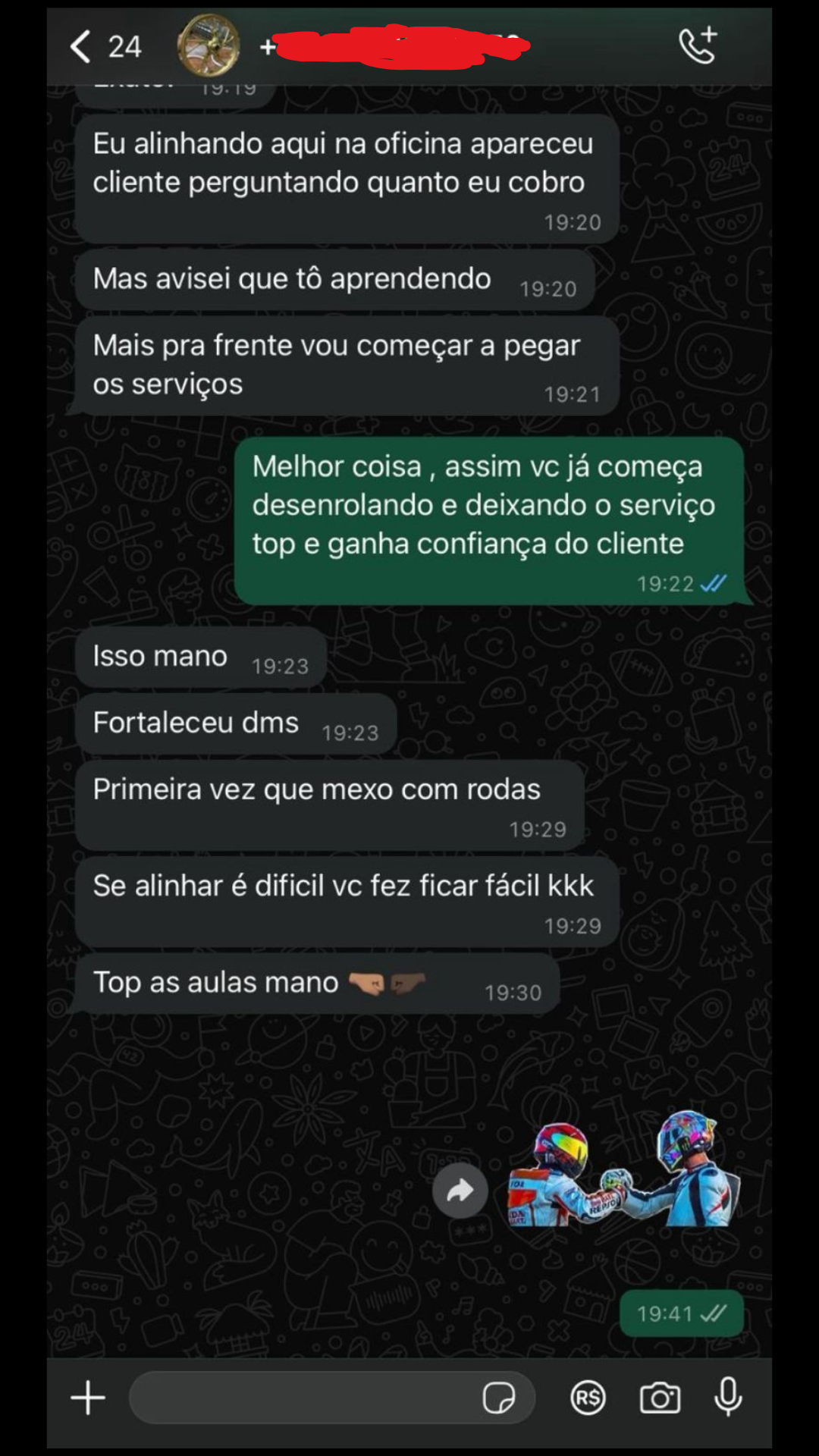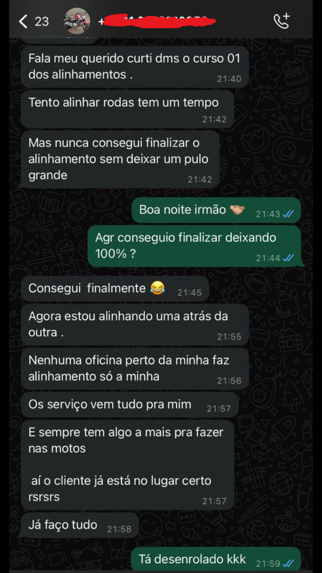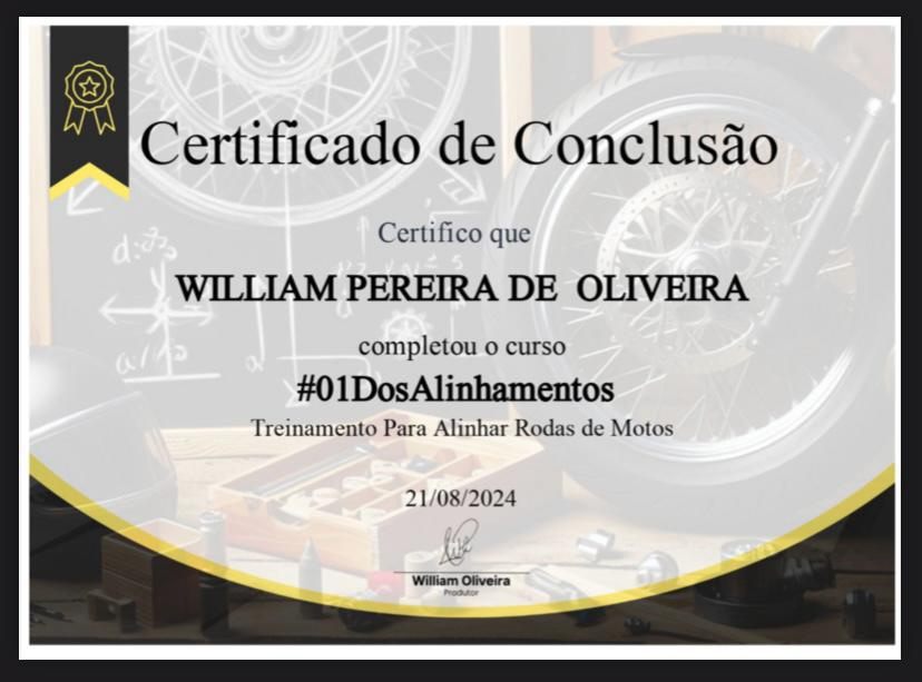 Me chamo William. Trabalho com motos há mais de 20 anos e sou referência em alinhamento de rodas, serviço que faço há mais de 15 anos. Na pandemia, enquanto tudo parou, foi justamente esse trabalho que manteve minha renda e muita gente viu isso de perto. Por ser um serviço escasso, com pouca mão de obra qualificada e alta procura nas oficinas, meus próprios clientes começaram a pedir para eu ensinar. Por isso criei este curso: para ajudar quem quer entrar no ramo, ter uma renda extra ou até transformar o alinhamento de rodas na sua renda principal. Hoje compartilho minha experiência para fortalecer quem quer aprender de verdade.